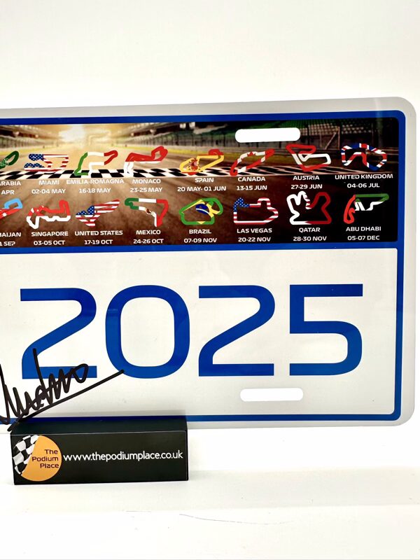 The licence plate commemorates the 2025 season with stunning artwork and with a high gloss finish, detailing each race in order with dates and associated track map and integrated national flag.