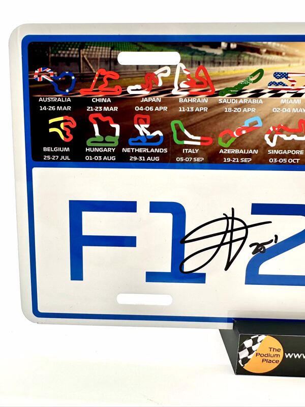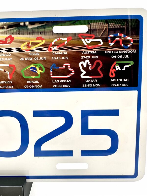 The licence plate commemorates the 2025 season with stunning artwork and with a high gloss finish, detailing each race in order with dates and associated track map and integrated national flag.