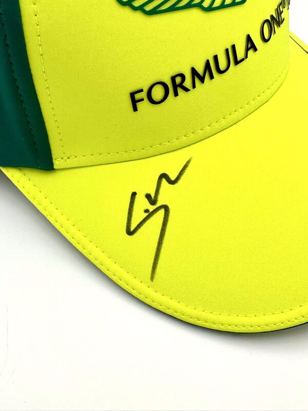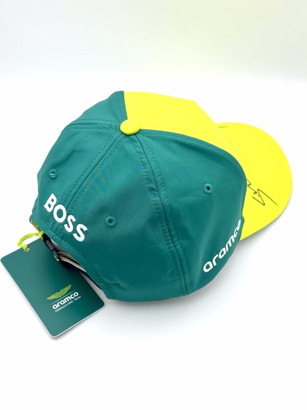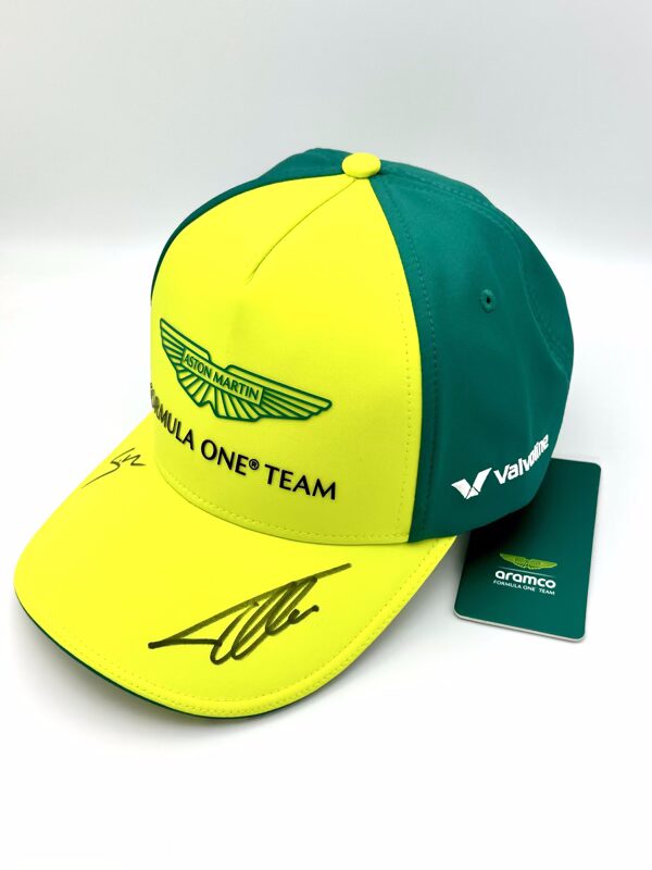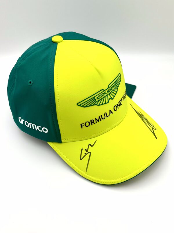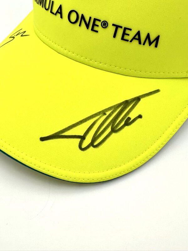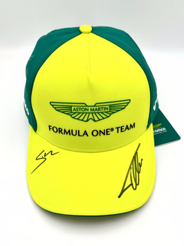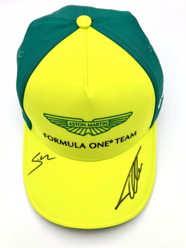Aston Martin Team 2025 British GP Cap Signed Fernando Alonso & Lance Stroll. A Distinctive Racing Green 2025 Cap signed by 2 times World Drivers Champion Fernando Alonso and Lance Stroll on the peak in black pen.