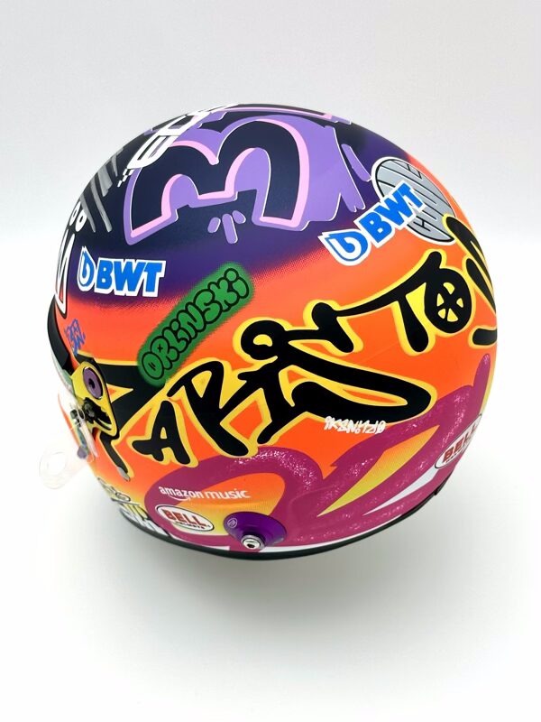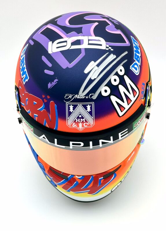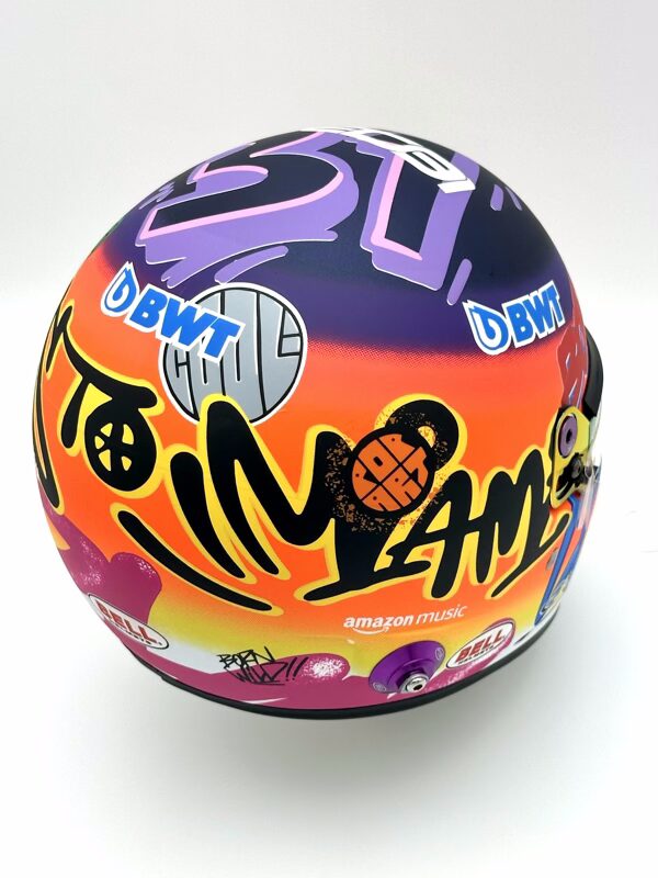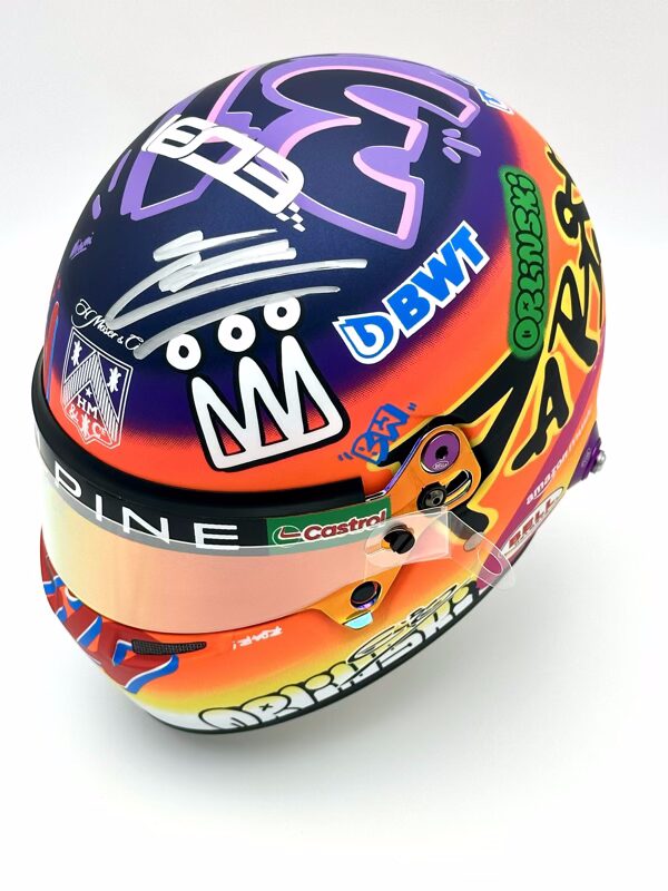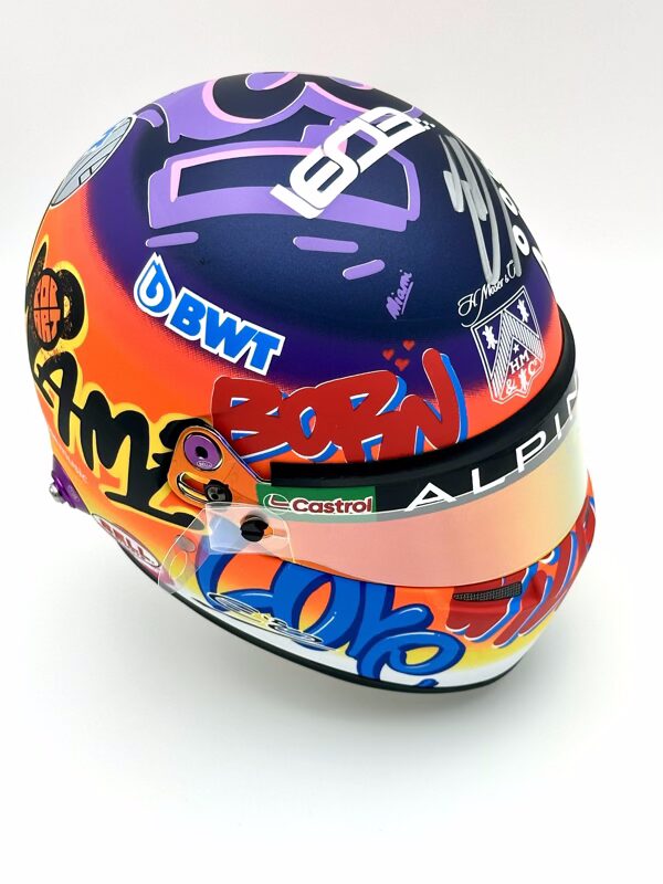 Esteban Ocon Signed 2024 Miami Orlinski 1:2 Mini Helmet with Upgrades.
