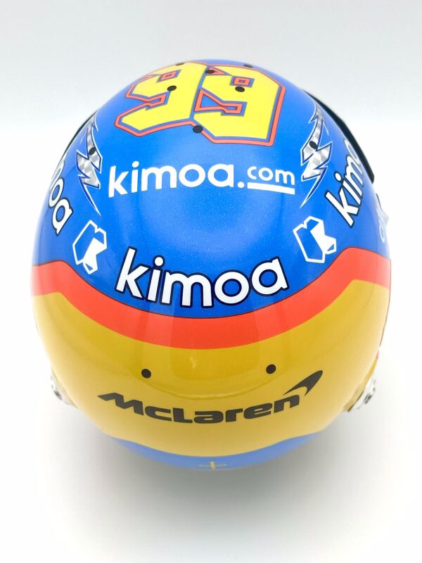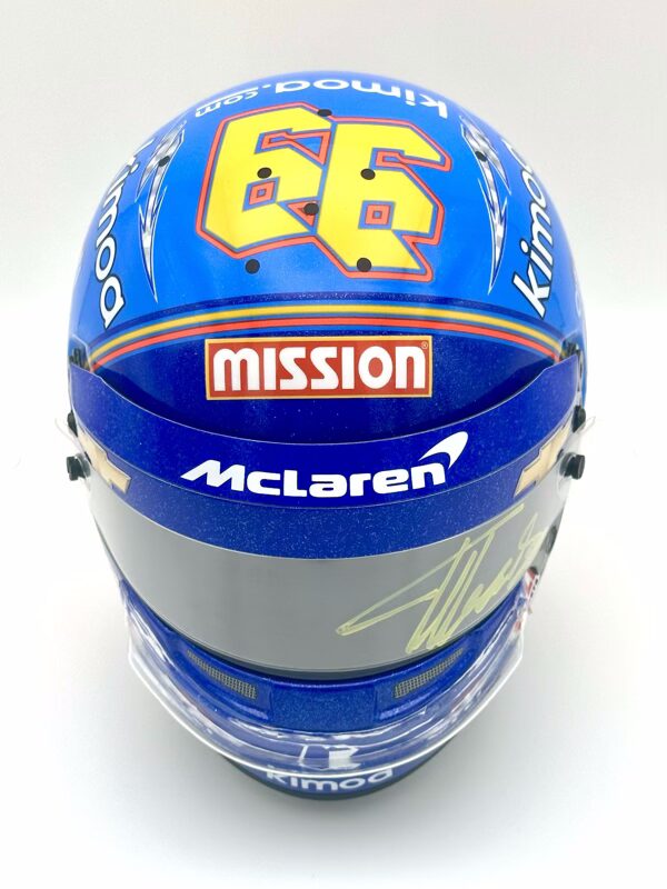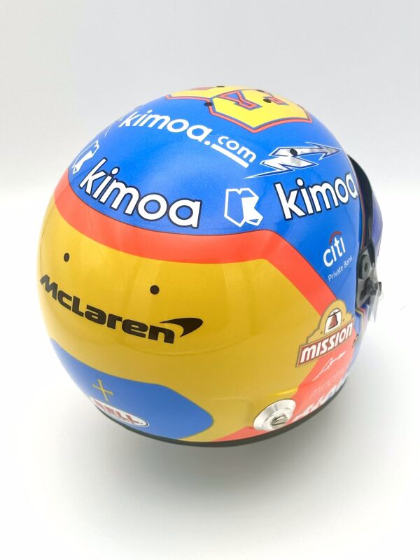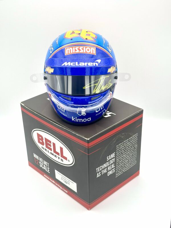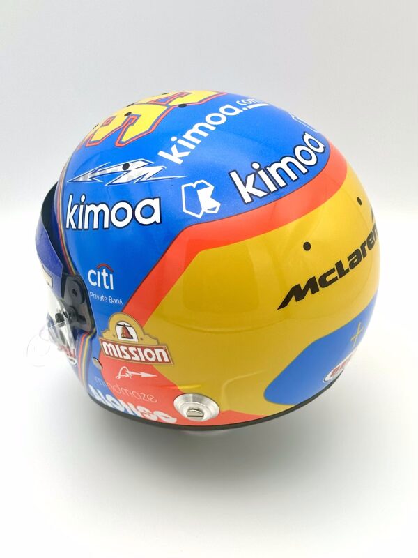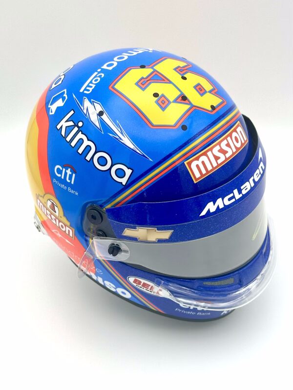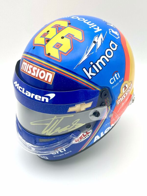 Fernando Alonso 2019 Indy 500 Replica half Helmet 1:2. Used by former double Formula 1 World Champion Fernando Alonso during his second attempt to capture motor racing’s Triple Crown (Monaco Grand Prix, 24 Hours of Le Mans, and the Indy 500). Alonso used this helmet in both aero trial testing sessions at Texas and at the Indianapolis Motor Speedway.