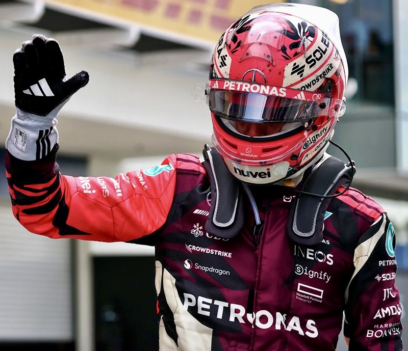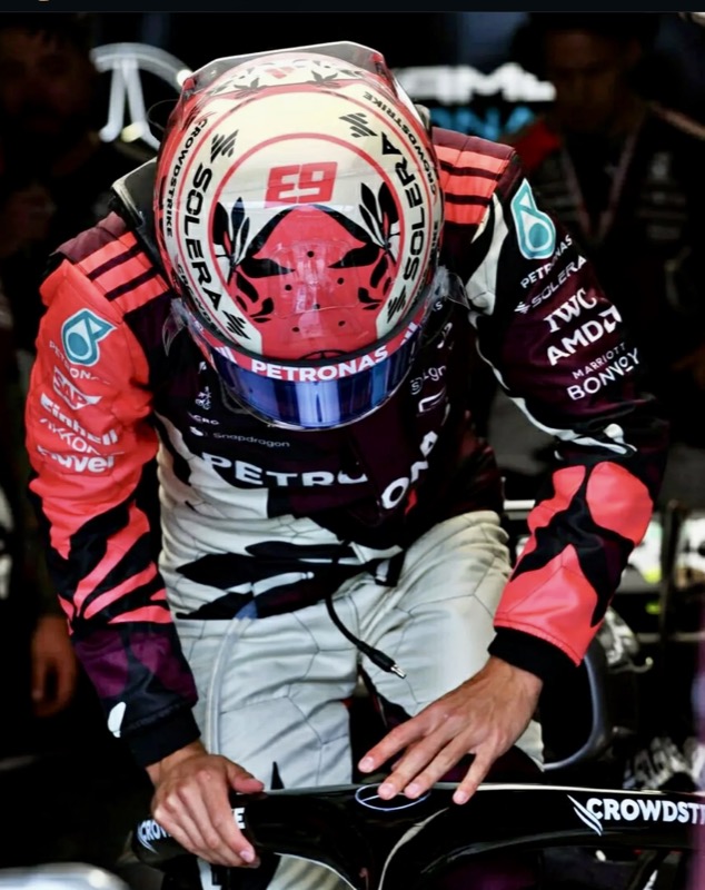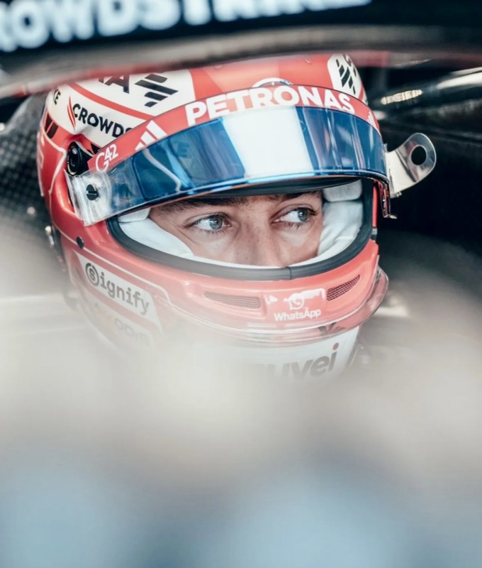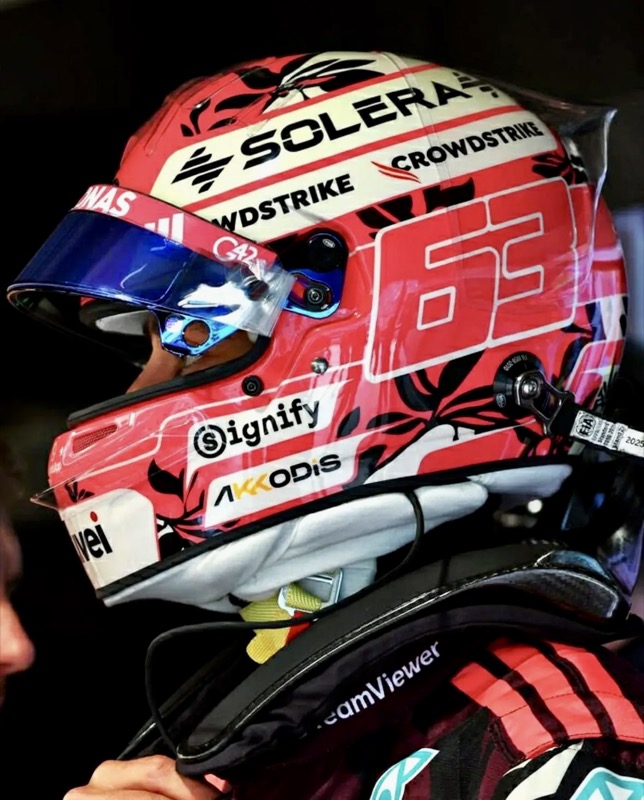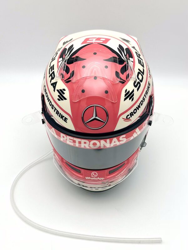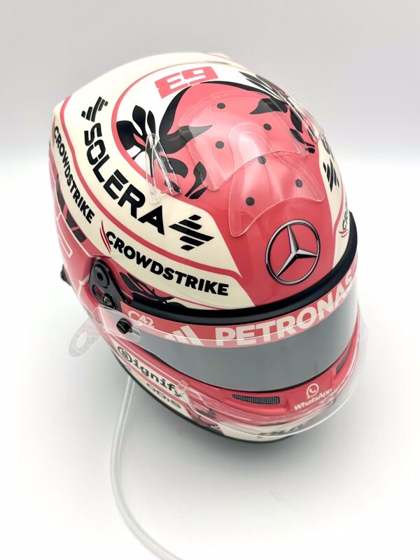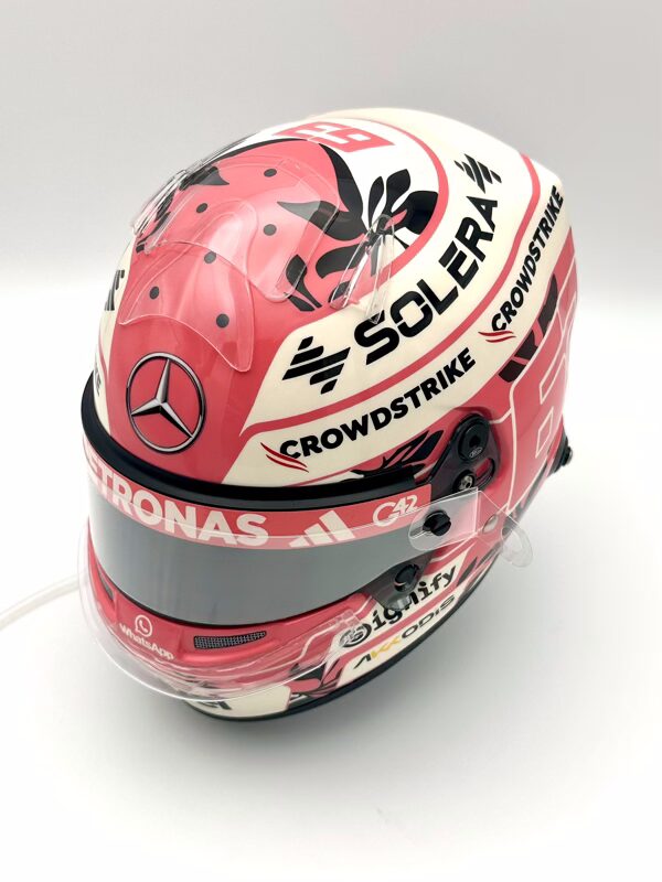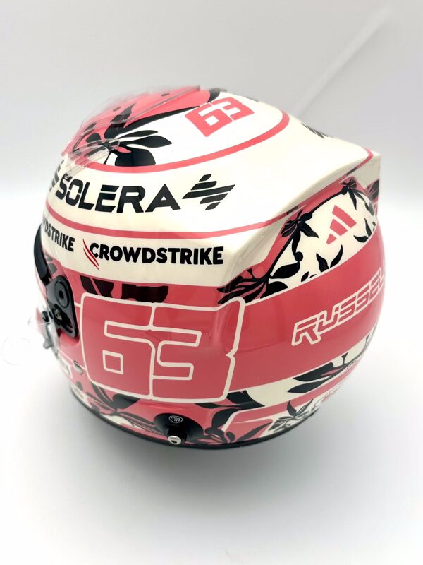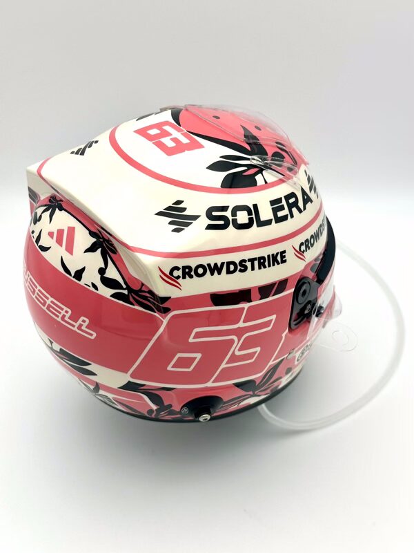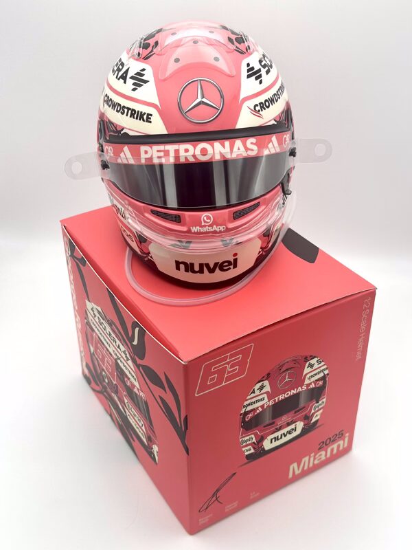George Russell 2025 Miami 1:2 Mini Special Edition Upgraded Helmet. Miami is always a highlight on the F1 calendar and to round it off George managed a podium in the main race wearing his special weekend helmet.