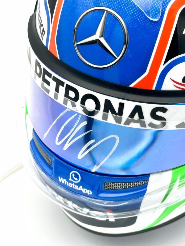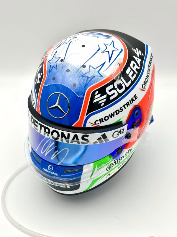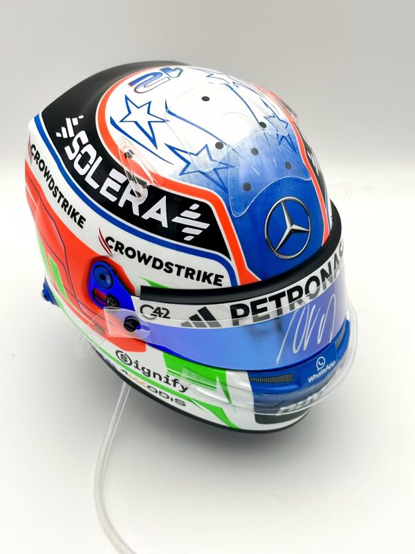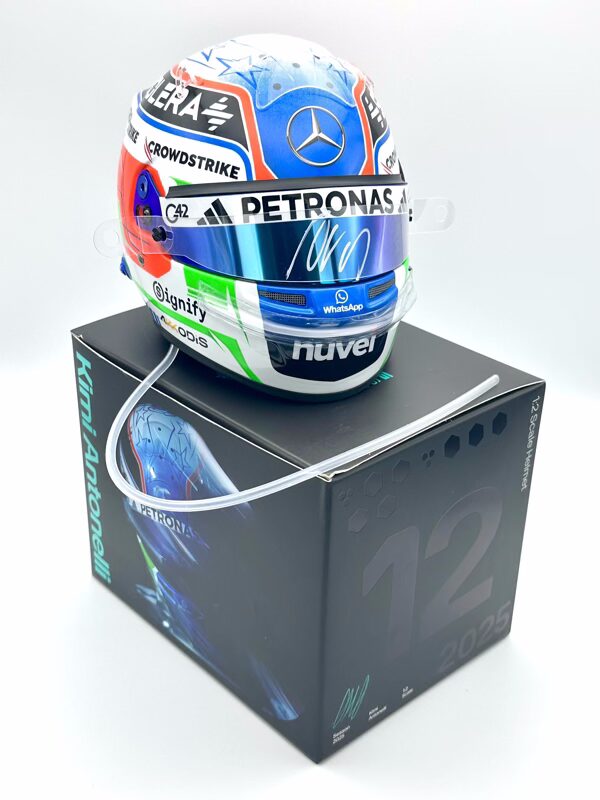 Kimi Antonelli Signed & Upgraded 2025 Season 1:2 Mini Helmet. What a rookie season Kimi is having so far…. Pole position, plenty of points and mixing it with the big boys. Not bad for just18 years old.