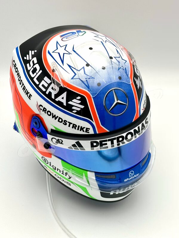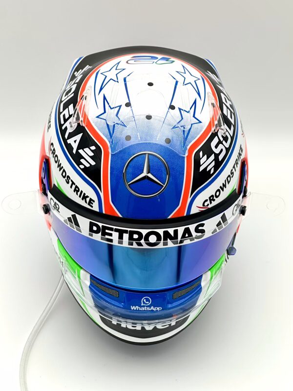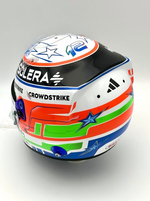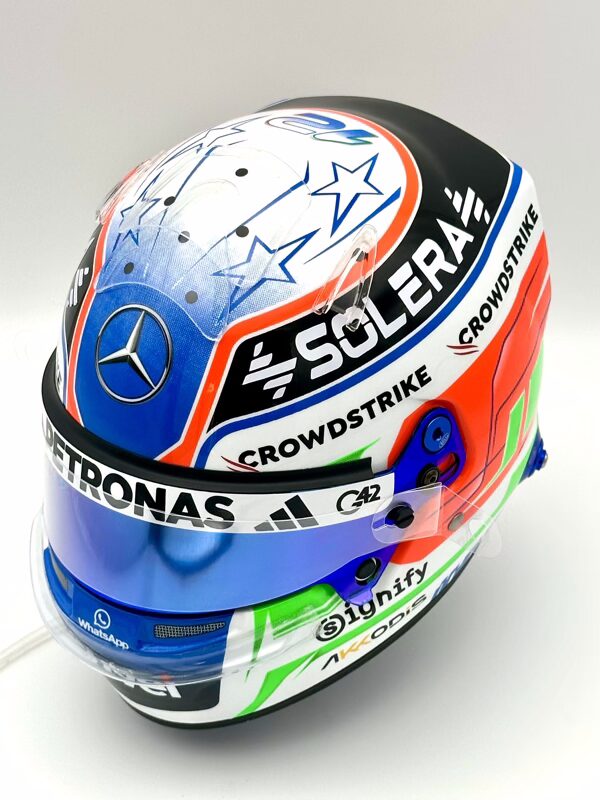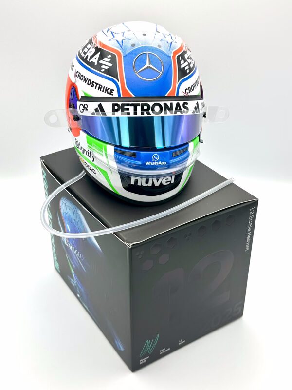 Kimi Antonelli Upgraded 2025 Season 1:2 Mini Helmet. What a rookie season Kimi is having so far…. Pole position, plenty of points and mixing it with the big boys. Not bad for just18 years old.