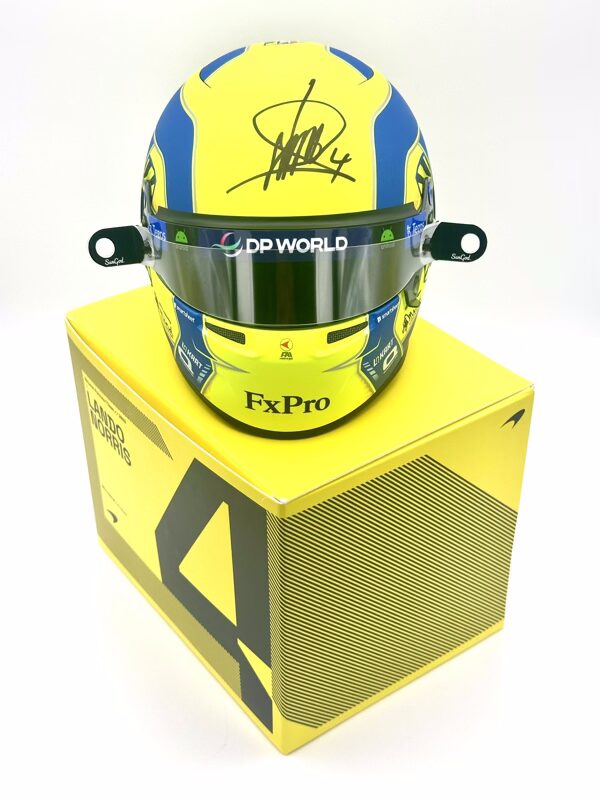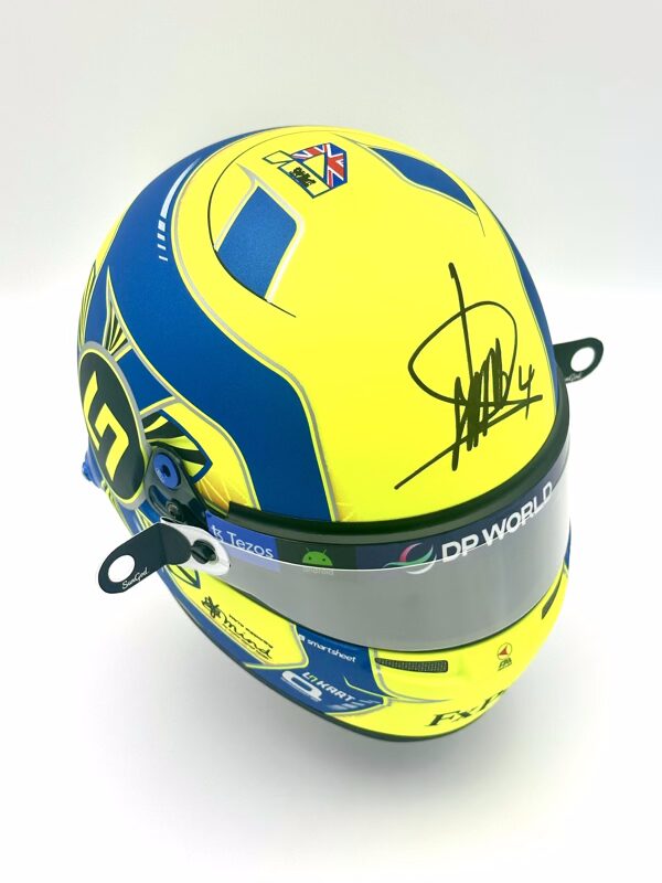 Lando Norris 2022 Season Signed and Upgraded 1:2 Mini helmet.  Beautifully signed in black ink, contrasting to the vivid yellow of the helmet.