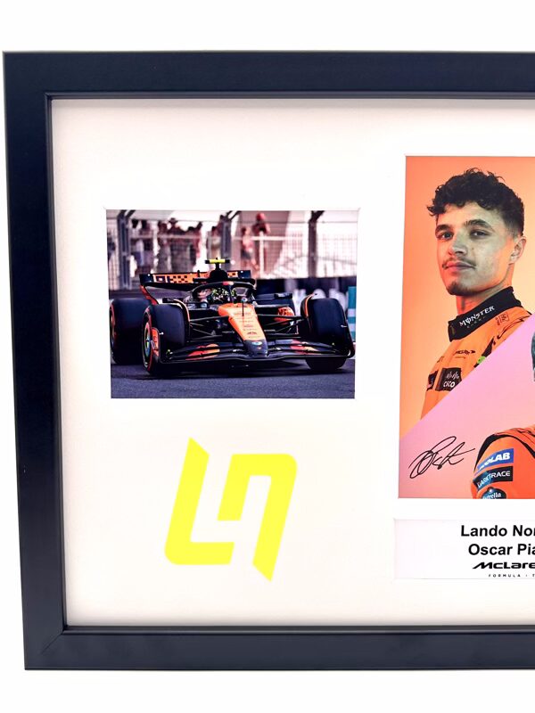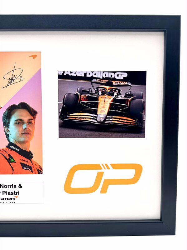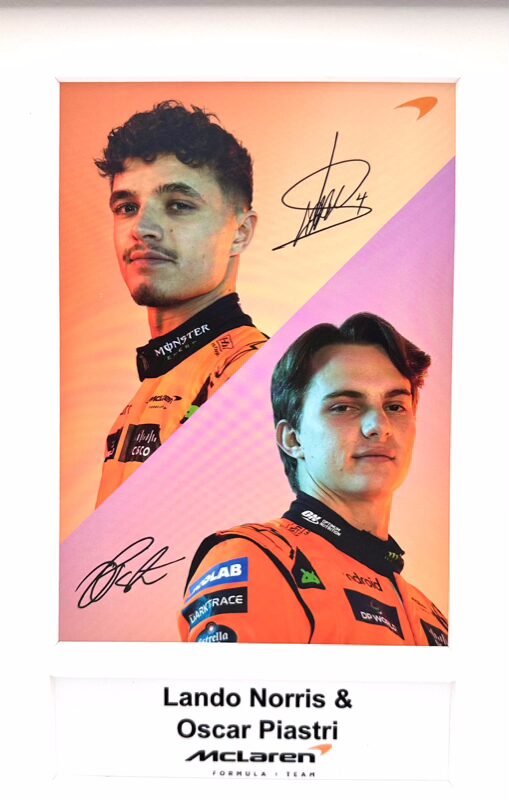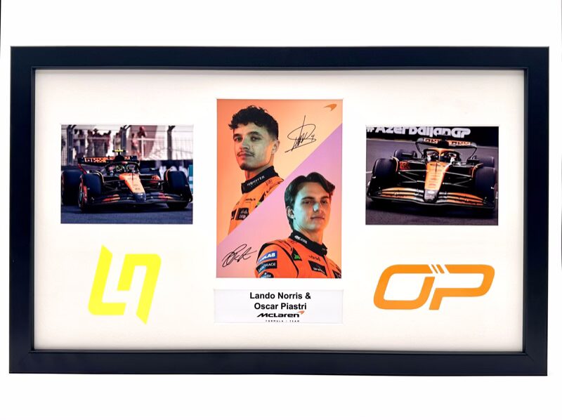 Lando Norris & Oscar Piastri McLaren Driver Card with printed signatures framed with 2 picture inserts of Oscar and Lando both in their cars and finished with a descriptive plaque and driver logos.