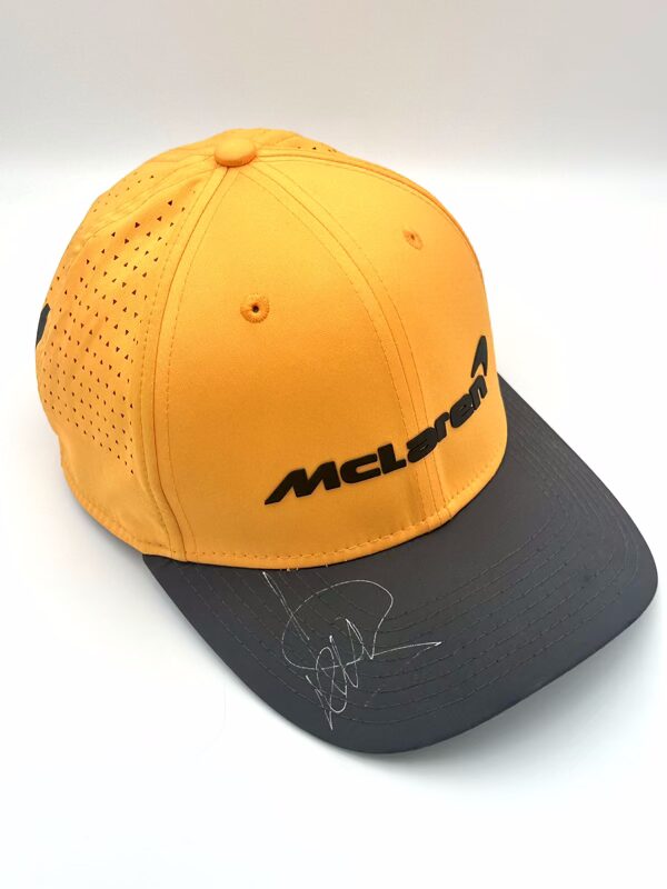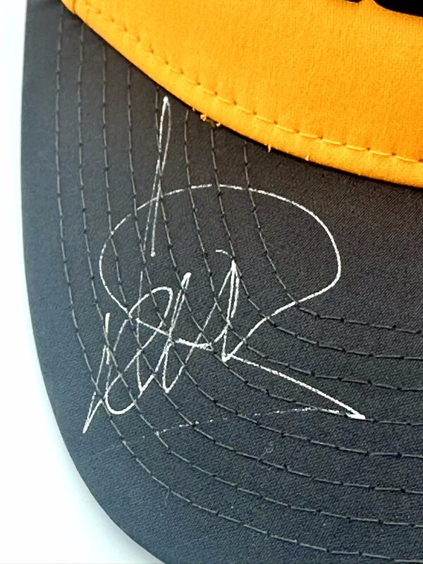 Stunning papaya cap with black peak signed in silver pen by Lando Norris.
