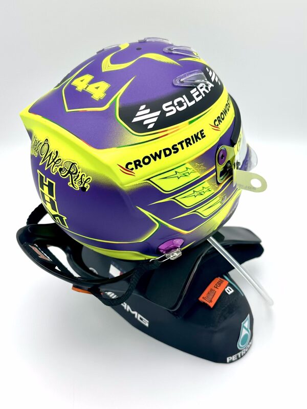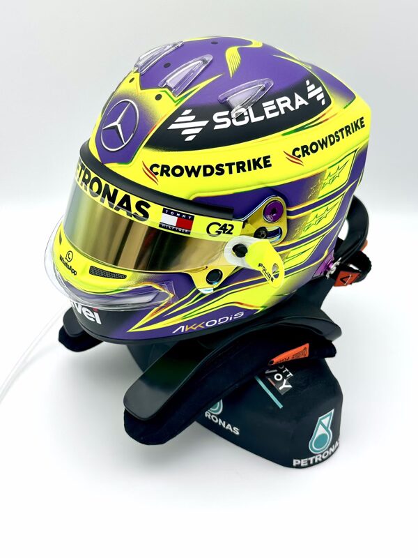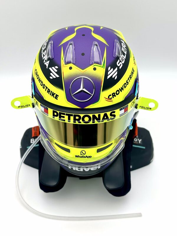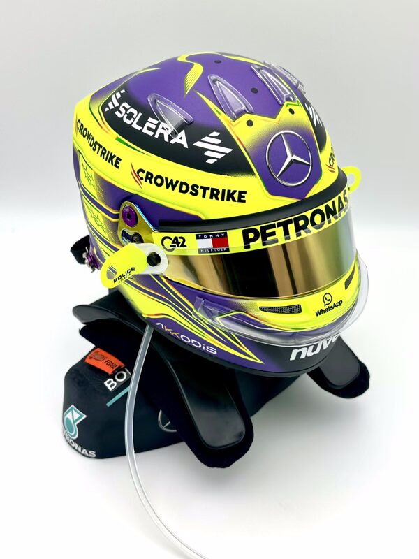 Lewis Hamilton 2024 Season Bell 1:2 Helmet Fully Upgraded + Bust + Hans with Podium Place upgrades to add authenticity including BELL aero sets and custom air dots, tear offs, drinks tube. Rounded off with realistic shoulders up bust integrated with a rare HANS device.
