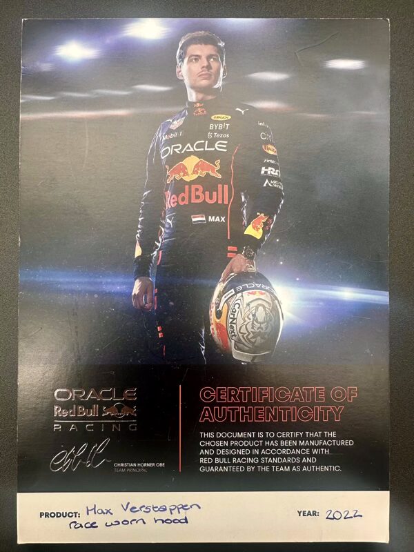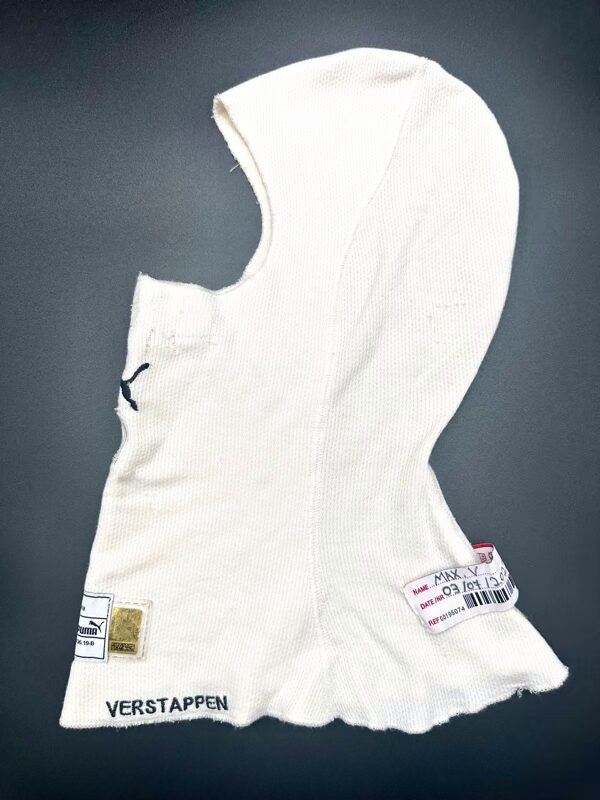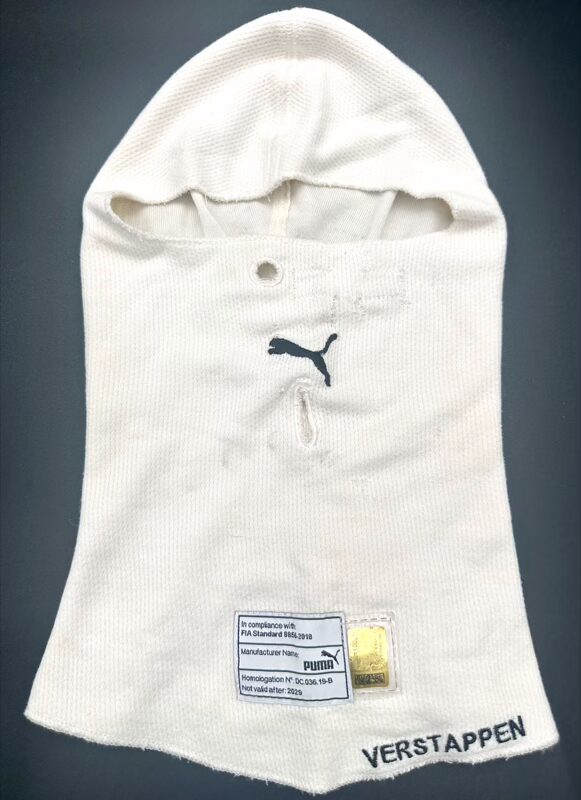 Max Verstappen 2022 Race Used NOMEX Balaclava Hood. A VERY RARE opportunity to own a piece of race used clothing worn by 4 times F1 World Drivers Champion Max Verstappen from 2022 which was one of his WDC years.
