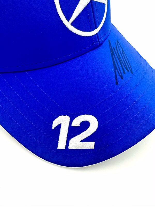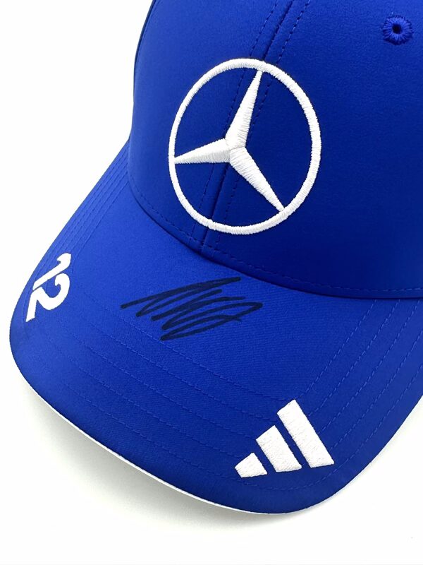 Direct from Mercedes F1 Team this 2025 Mercedes Cap, with Kimi’s driver number #12 on a vivid blue colour scheme, this cap has been signed by Kimi in black pen.