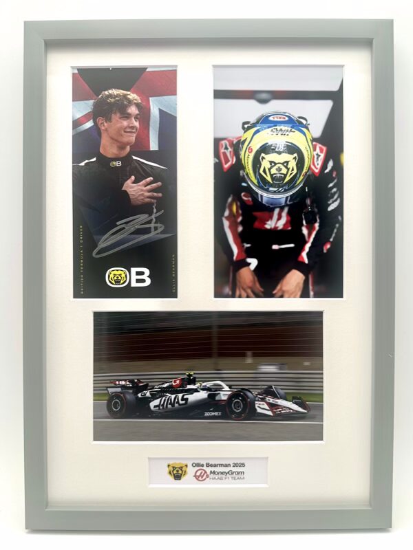 MoneyGram Haas F1 Ollie Bearman Signed and Framed Driver’s Card with Photos and descriptive plaque