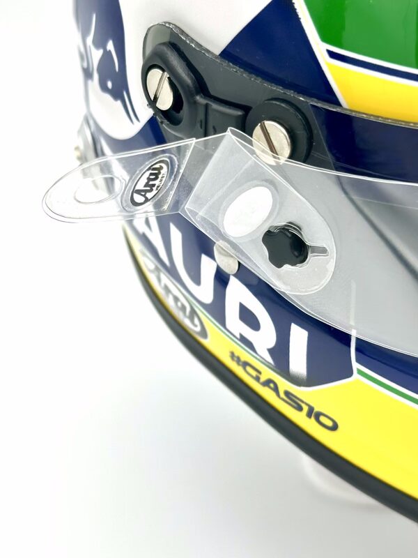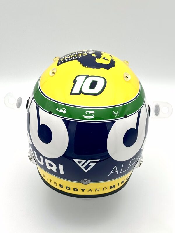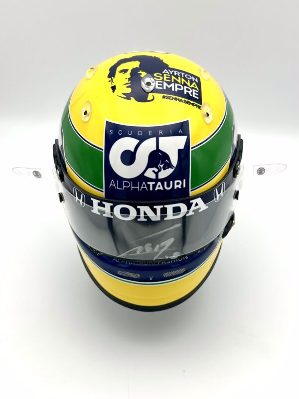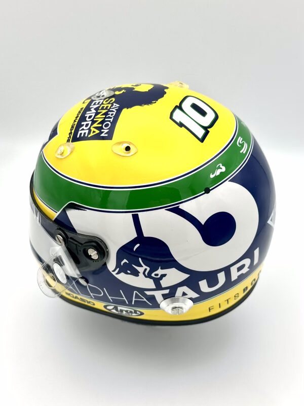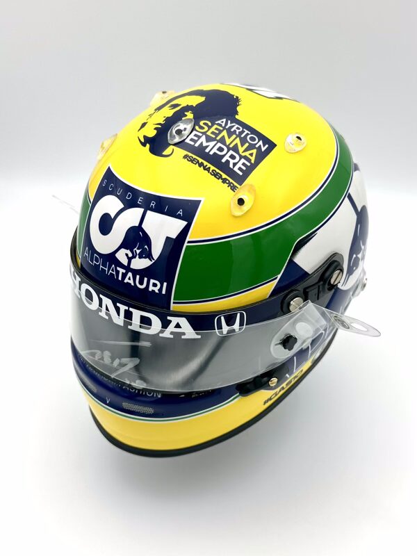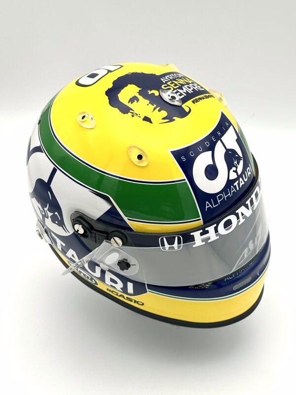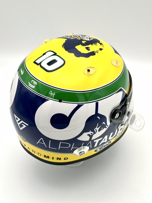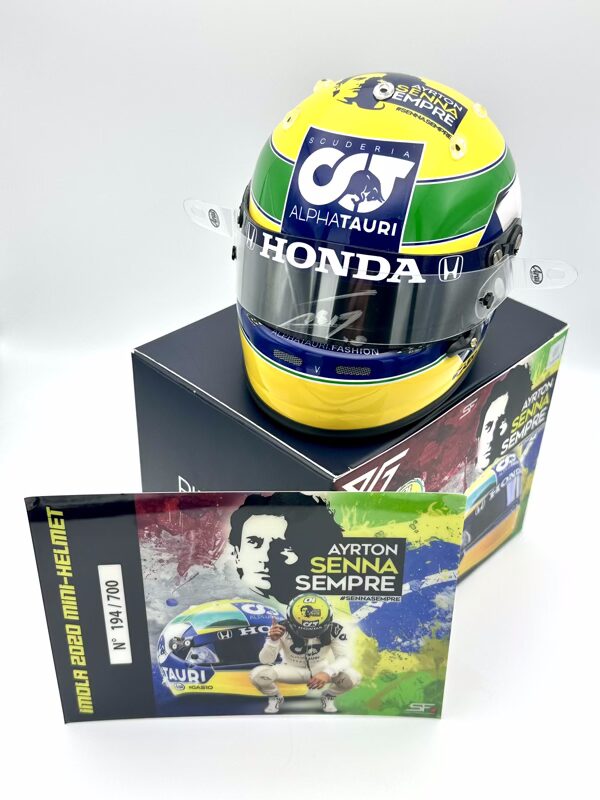 Pierre Gasly Signed 2020 Imola Senna Tribute 1:2 Mini Helmet + Upgrades. A stunning and iconic mini F1 Arai helmet limited to 700 pieces.