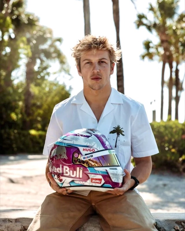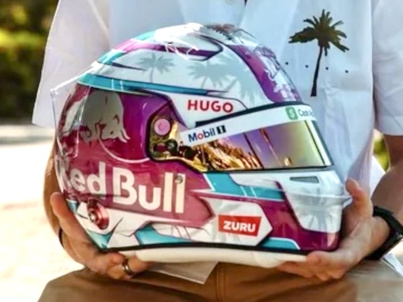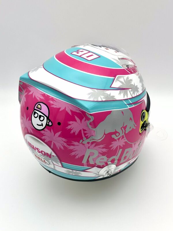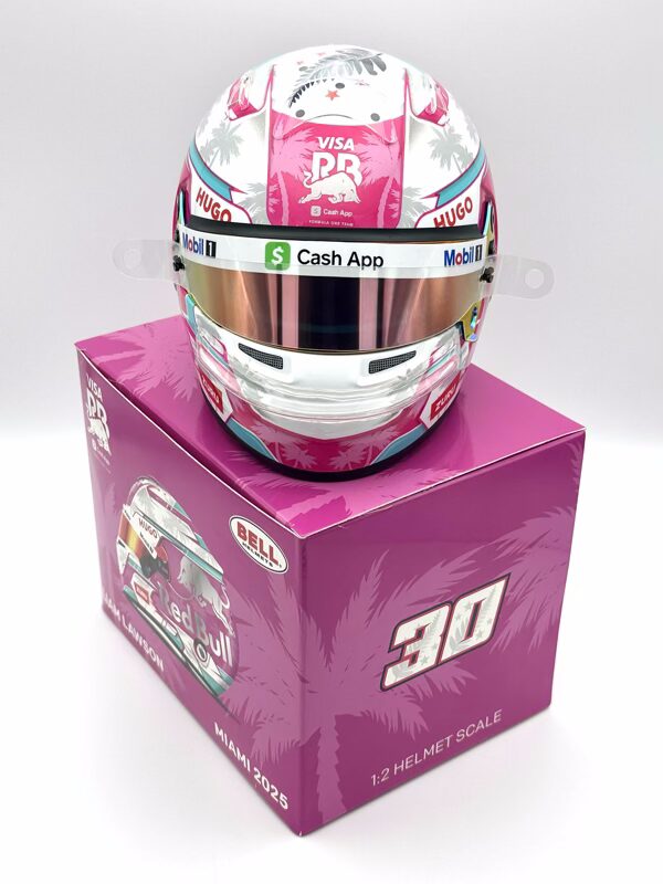 Racing Bulls Upgraded Liam Lawson 2025 Miami 1:2 Mini Ltd Edition Helmet.  A stunning Miami inspired special with this race being a highlight on the F1 calendar.