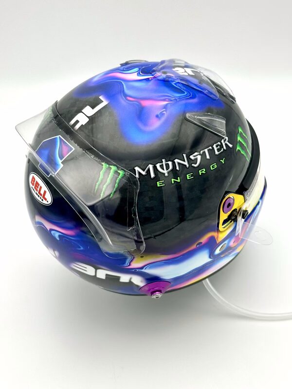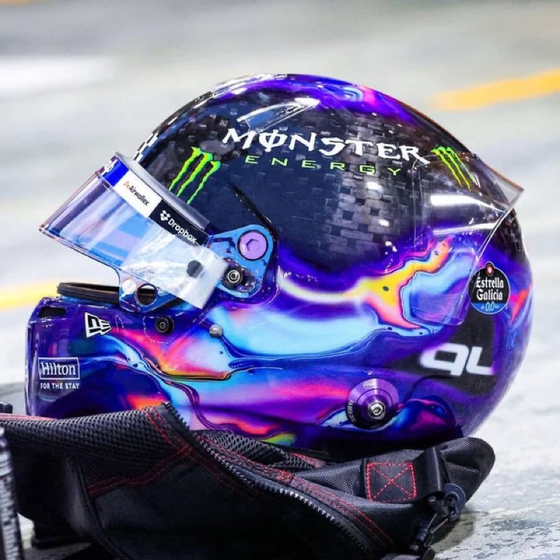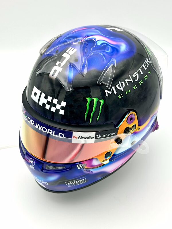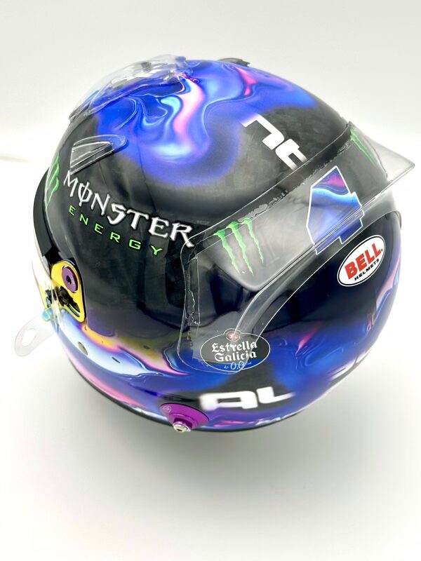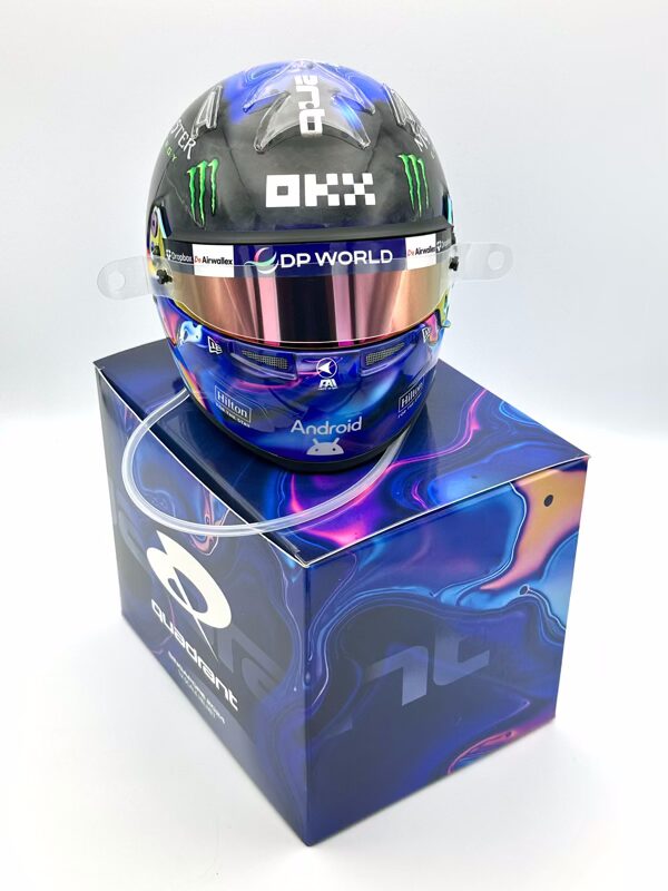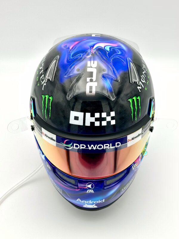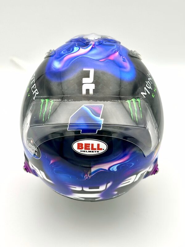 Lando Norris 2024 Singapore Quadrant 1:2 Helmet Fully Upgraded. Stunning carbon look with Podium Place upgrades including full BELL and custom aero sets, rain grommet, visor strip, drinks tube and tear offs.