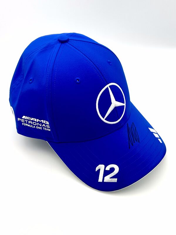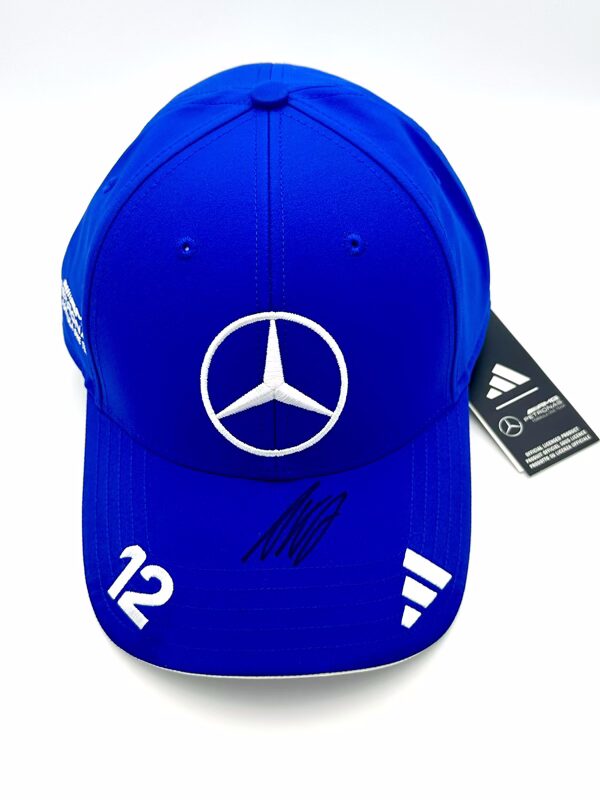 Direct from Mercedes F1 Team this 2025 Mercedes Cap, with Kimi’s driver number #12 on a vivid blue colour scheme, this cap has been signed by Kimi in black pen.